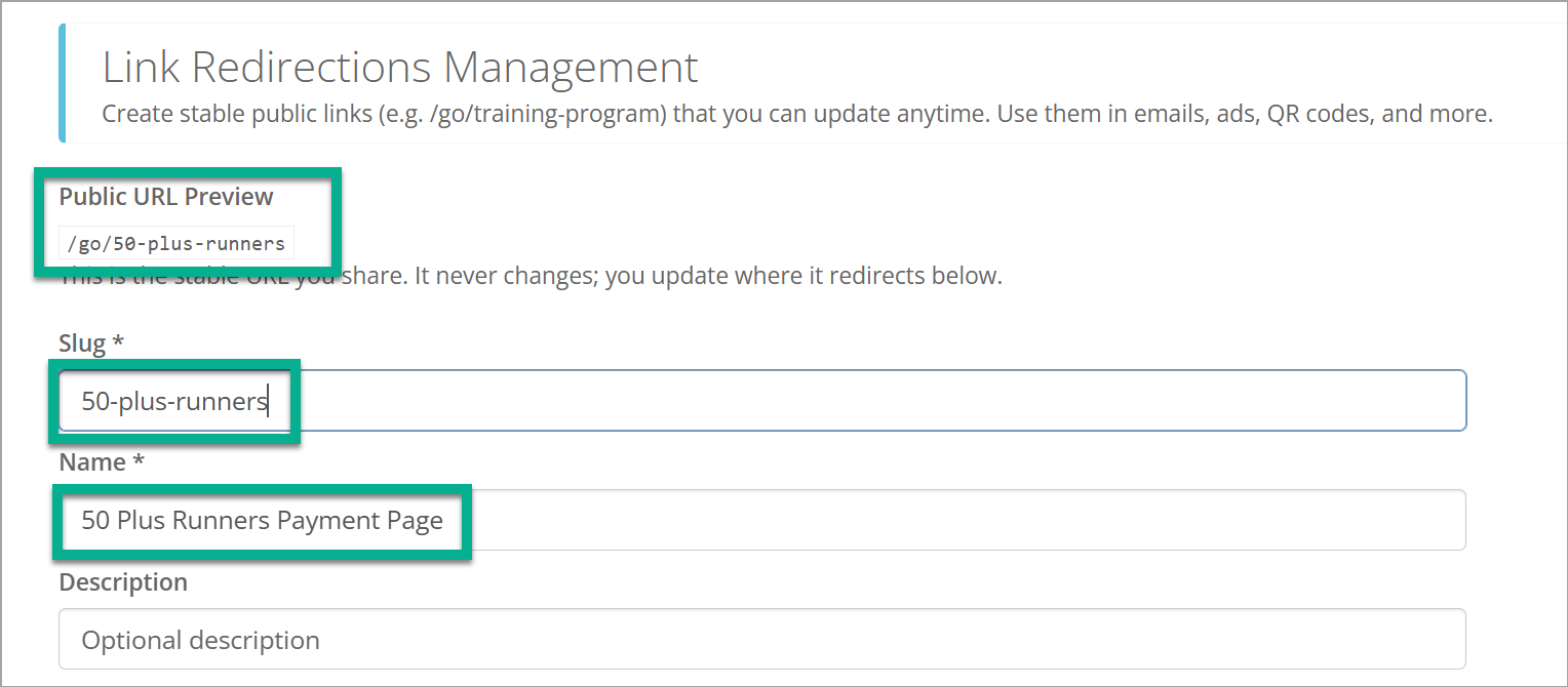 Type the link you want. This is the link you will share, not the page people will end up landing on. Also give it a meaningful name and an optional description. As you type the link it will automatically show the preview of the link in the public URL preview section.