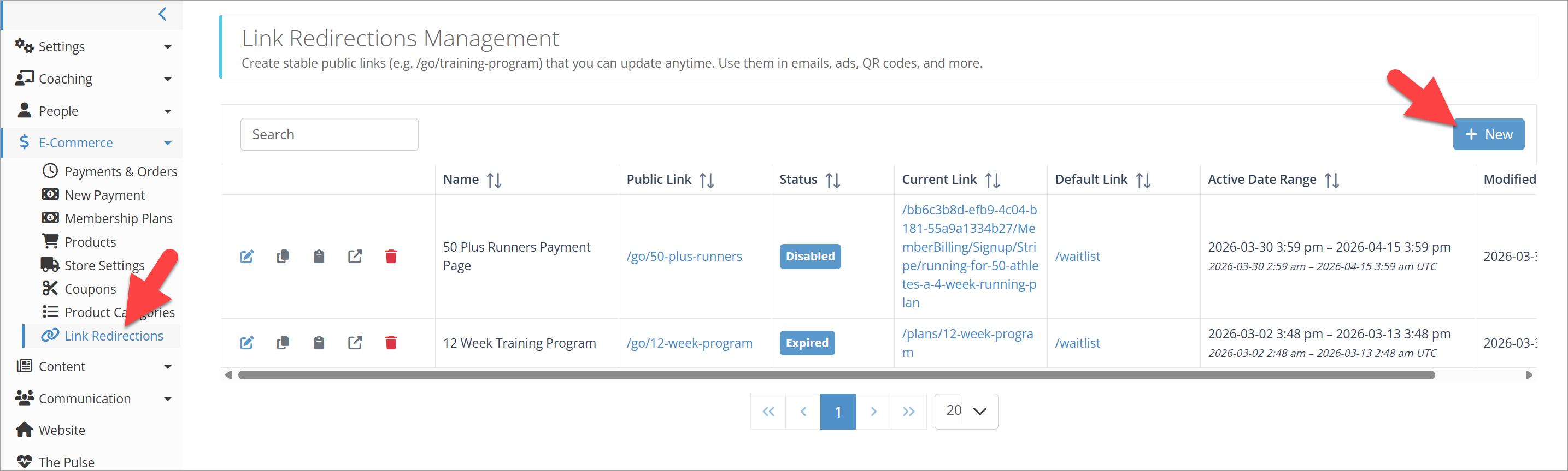 To create a new link go to Link Redirections from the E-commerce menu, and add a new link.