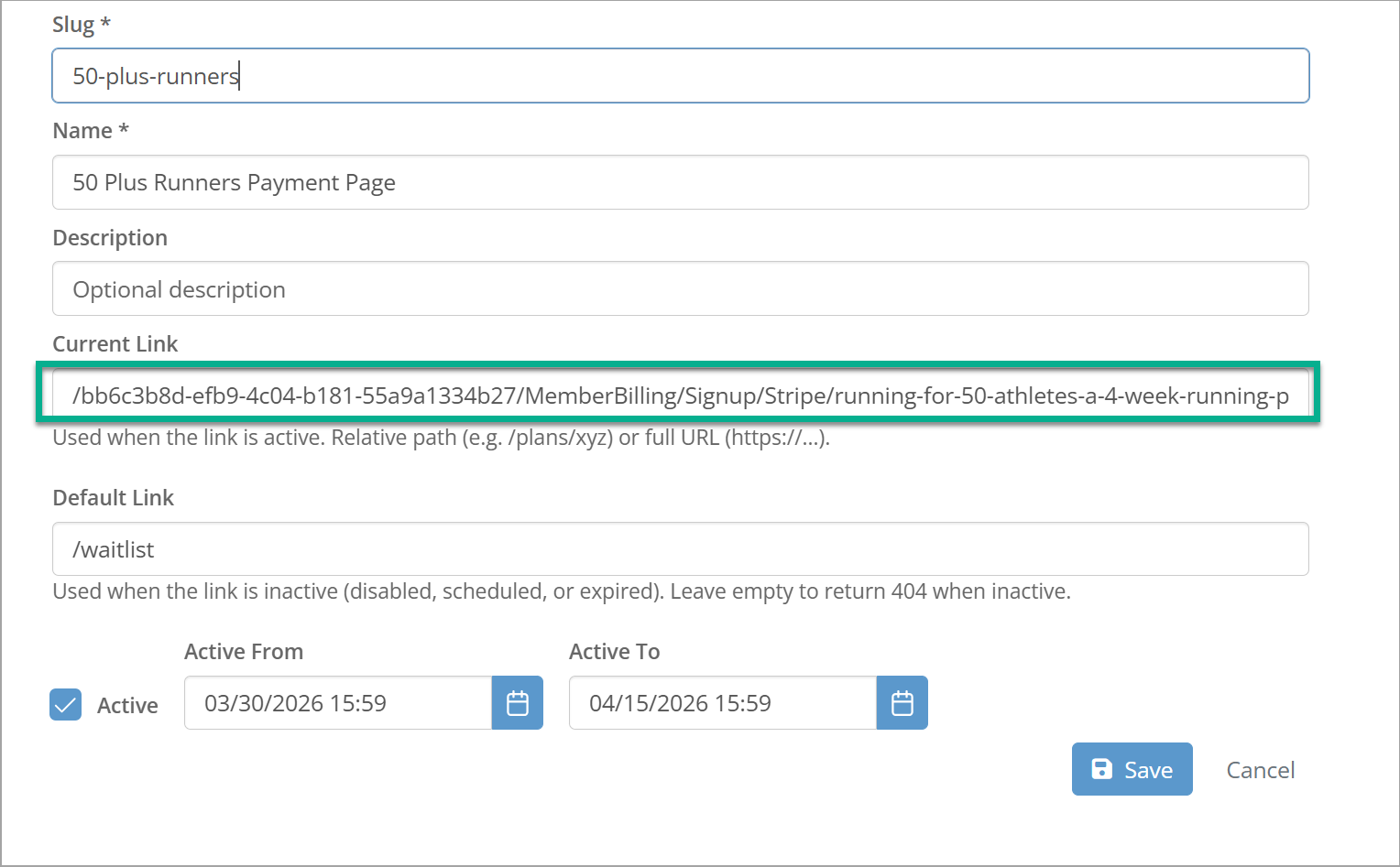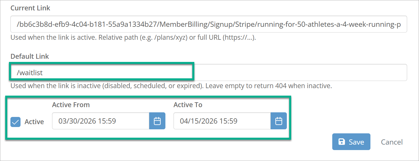 Now you can type in an optional "Default Link" this is where the link will redirect to when the link is no longer active. If you don't enter a default link then the link will just redirect to a 404 not found when it expires or is set inactive. In the example our default link is a waitlist page, so when our program closes we can still capture potential customers details.